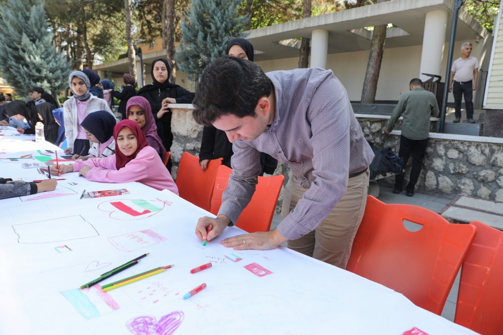 Kaymakam Muhammet GÜZEL de etkinlikte çocuklarla birlikte tuvale yazdığı “From the river to the sea, Palestine will be free” (Nehirden denize özgür Filistin) ifadesiyle destek mesajını iletti.